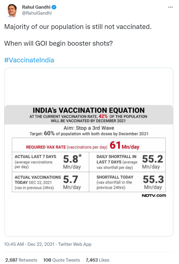 On December 22, Congress leader Rahul Gandhi claimed that the majority of India’s population is still not vaccinated. He used NDTV’s India’s Vaccination Equation to back his claim. According to NDTV, at the current rate, 42% of India’s population will be vaccinated by the end of December 2021. The target, according to the post, is to vaccinate 60% of the population by end of the year, which would require 61 million doses per day. NDTV said the dose per day rate is currently 5.8 million doses per day, and there is a shortfall of 55.3 million doses per day.