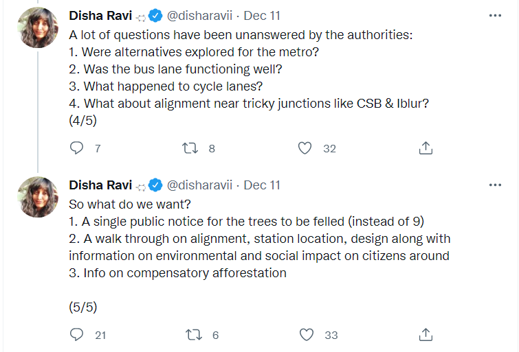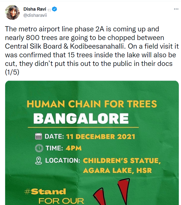 On Saturday (December 11), Greta toolkit fame ‘climate activist’ Disha Ravi took to Twitter to cast aspersions about the upcoming airport metro project. “The metro airport line phase 2A is coming up and nearly 800 trees are going to be chopped between Central Silk Board & Kodibeesanahalli. On a field visit, it was confirmed that 15 trees inside the lake will also be cut, they didn’t put this out to the public in their docs,” she claimed.