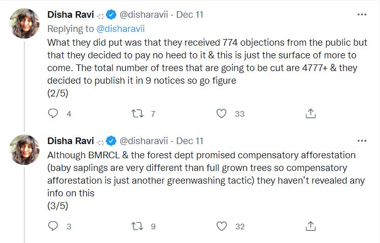 She further claimed, “What they did put was that they received 774 objections from the public but that they decided to pay no heed to it & this is just the surface of more to come. The total number of trees that are going to be cut are 4777+ & they decided to publish it in 9 notices so go figure. Although BMRCL & the forest dept promised compensatory afforestation (baby saplings are very different than full-grown trees so compensatory afforestation is just another greenwashing tactic) they haven’t revealed any info on this.”