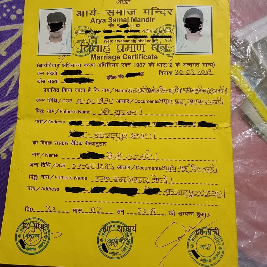 Pratibha also showed Swarajya her marriage certificate, which was issued by an “Arya Samaj mandir” on March 20, 2018. The temple’s address is Sector H of Harsh Vihar in the Aliganj area of Lucknow district, according to the certificate.