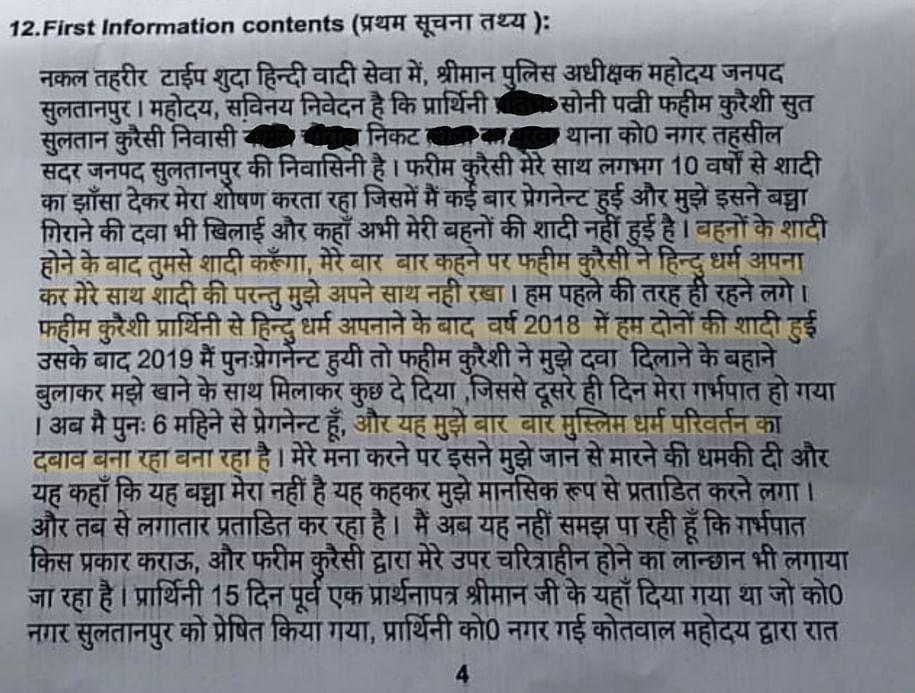 The FIR (number 1082/2021) filed at City Kotwali police station in Sultanpur, Uttar Pradesh on November 27, named Faheem as a suspect under IPC sections 498A (harassment of woman subjecting her to cruelty), 313 (causing marriage without women’s consent), 494 (marrying after having a husband or wife) and 506 (criminal intimidation).