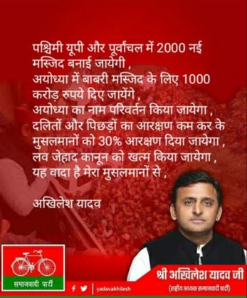 A message being widely circulated on Whatsapp claims Samajwadi Party (SP) chief Akhilesh Yadav has promised to construct 2000 new mosques in the West and Purvanchal region of Uttar Pradesh if his party is voted to power in the upcoming 2022 Uttar Pradesh Assembly elections. According to the message, in addition to the 2000 mosques, the SP chief pledged a 30% reservation for Muslims by abolishing Dalits and Backward classes reservations.