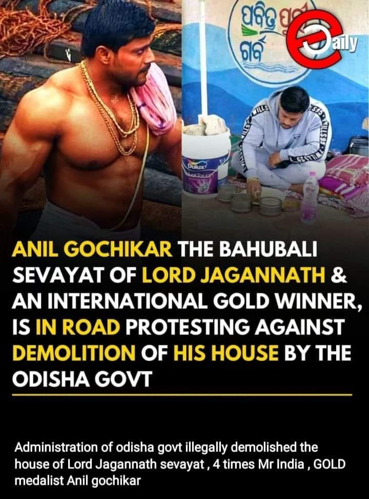 Anil Gochhikar, who is a successful and popular bodybuilder and has won many international accolades in bodybuilding, belongs to a family of Sevayats of the Sri Jagannath Temple in Puri. Gochhikar says that their family had buildings very close to the Shri Jagannath Temple which were demolished by the government despite an ongoing legal process. He says that the family has been offered a compensation amount and an offer for an alternate site in exchange for the plot. But Gochhikar believes the compensation money is not enough and the alternate plot offered by the Odisha government is “too far away” from the Jagannath Temple.