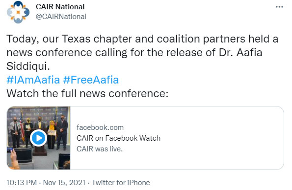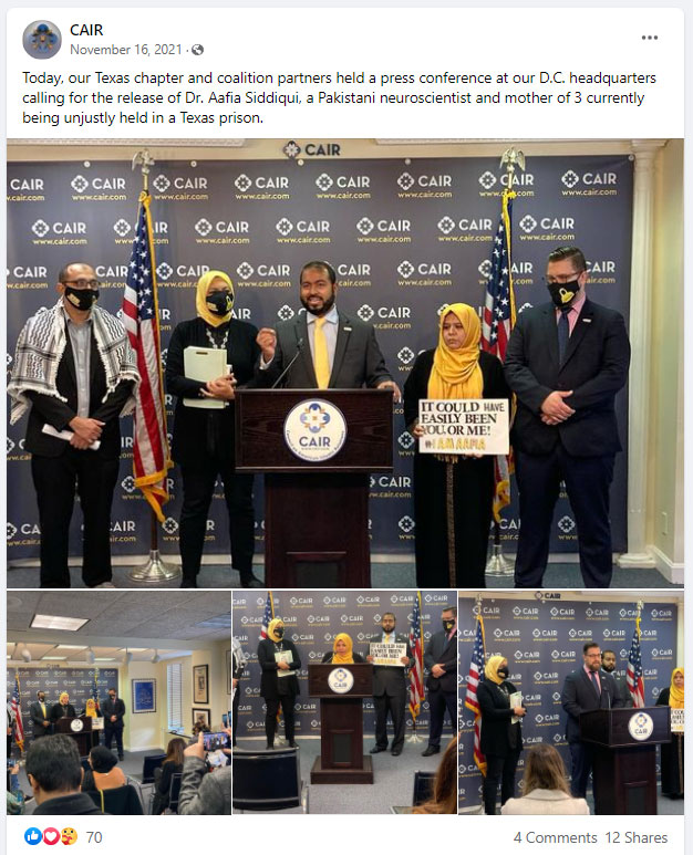 On November 15, the Texas chapter of CAIR and its coalition partners organized a program to seek the release of Aafia Siddiqui. In a Facebook post, they wrote, “Today, our Texas chapter and coalition partners held a press conference at our DC headquarters calling for the release of Dr Aafia Siddiqui, a Pakistani neuroscientist and mother of 3 currently being unjustly held in a Texas prison.”