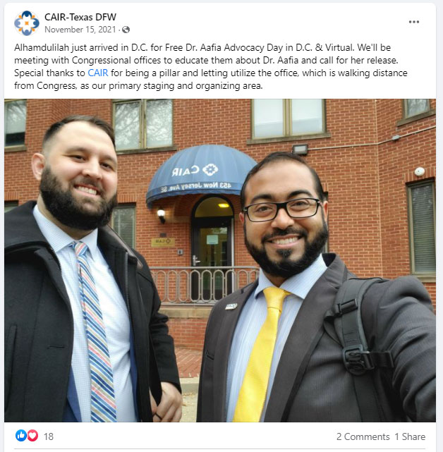 In a post, CAIR Texas DFW wrote, “We’ll be meeting with Congressional offices to educate them about Dr Aafia and call for her release. Special thanks to CAIR for being a pillar and letting utilize the office, which is walking distance from Congress, as our primary staging and organizing area.”