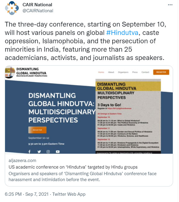 CAIR also extended support for the extremely Hinduphobic ‘Dismantling Global Hindutva‘ conference.