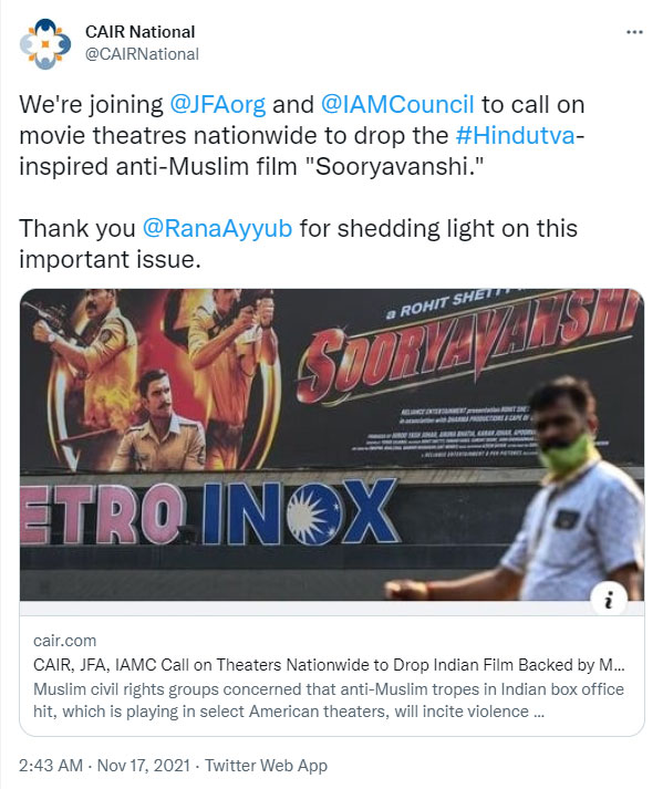 Another noteworthy aspect of CAIR is its Hinduphobic nature. Just two days after demanding the release of Aafia in November, CAIR launched Hinduphobic propaganda based on a report by alleged journalist Rana Ayyub. In a press release, CAIR demanded the movie theatres not to release Sooryavanshi, a Hindi movie. In the press release, CAIR alleged the movie spreads “disgusting and dangerous” anti-Muslim propaganda inspired by the fascist Hindutva movement.”