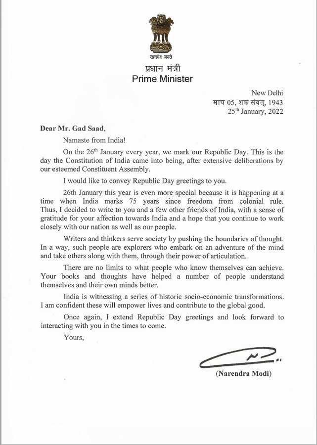 In this letter, it is said that “Dear Mr. Gad Saad, Namaste from India! On the 26th of January every year, we mark our Republic Day. This is the day the Constitution of India came into being, after extensive deliberations by our esteemed Constituent Assembly. I would like to convey Republic Day greetings to you. 26th January this year is even more special because it is happening at a time when India marks 75 years since freedom from colonial rule. Thus, I decided to write to you and a few other friends of India, with a sense of gratitude for your affection towards India and hope that you continue to work closely with our nation as well as our people.”