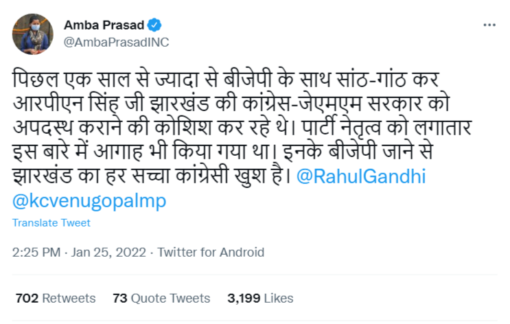 Similar claims were made by other Congress leaders. Jharkhand MP (Barkagaon) Amba Prasad had tweeted, “For the past 1 year, Singh was conspiring along with the BJP to destabilise the Congress-JMM government in Jharkhand. We had notified the party leadership on several occasions. Every true Congressman is happy after he has defected to the BJP.”