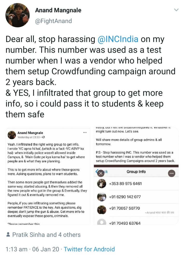 What is more curious here is that Anand Mangnale, the cofounder of Crowdnewsing as well as OurDemocracy, had planted himself in WhatsApp groups in January 2020 during the violence that took place in JNU where he appeared to be coordinating the violence that was taking place on the campus.