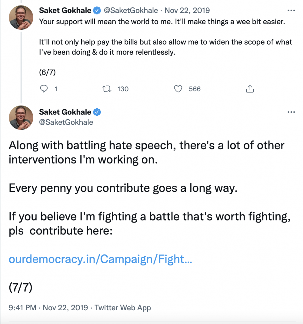 One of the platforms used by TMC leader Saket Gokhale to raise funds for his ‘sustenance’ as he filed Rs 10 RTI full time while not holding on to a regular day job, was ‘OurDemocracy.in’. In November 2019, Gokhale tweeted a link to his crowdfunding platform asking people to cough up money because he chose to give up his ‘cushy job’ to ‘fight the BJP/RSS’, which he usually did with filing frivolous RTIs which cost Rs 10. He urged other Modi haters to assemble and pay him so he can pay his bills and not have to take up a regular job.