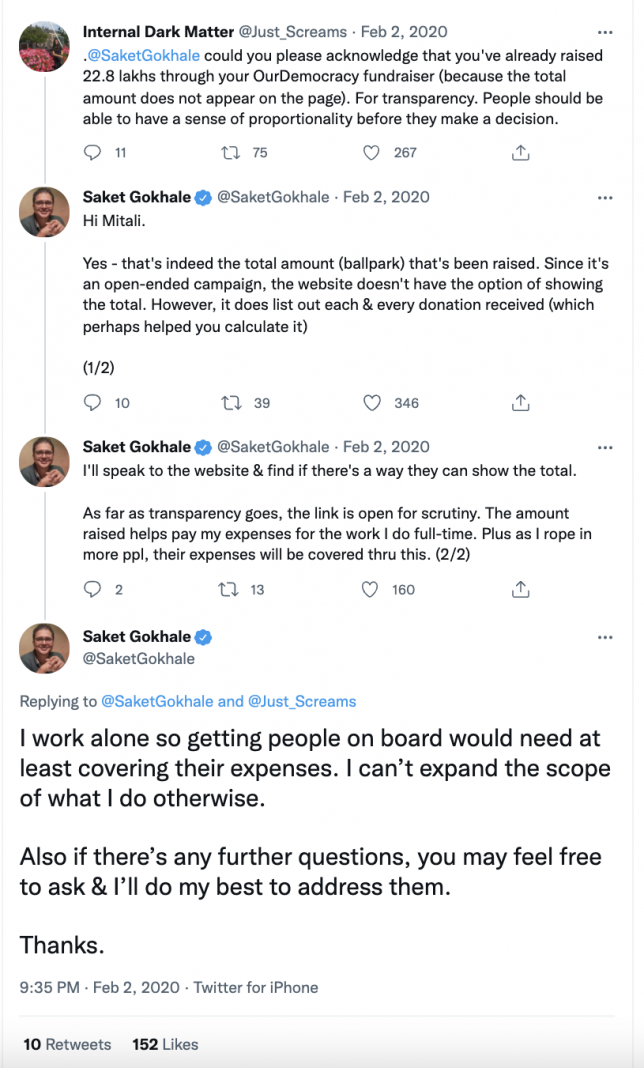 Gokhale had accepted that he had collected over Rs 22 lakh. He had then claimed he would be roping in more people to help him file Rs 10 RTIs to cover their basic living expenses. Turns out, OurDemocracy crowdfunding platform was not giving the total figure of the amount raised. So those who contributed did not quite know how much Gokhale had already raised.