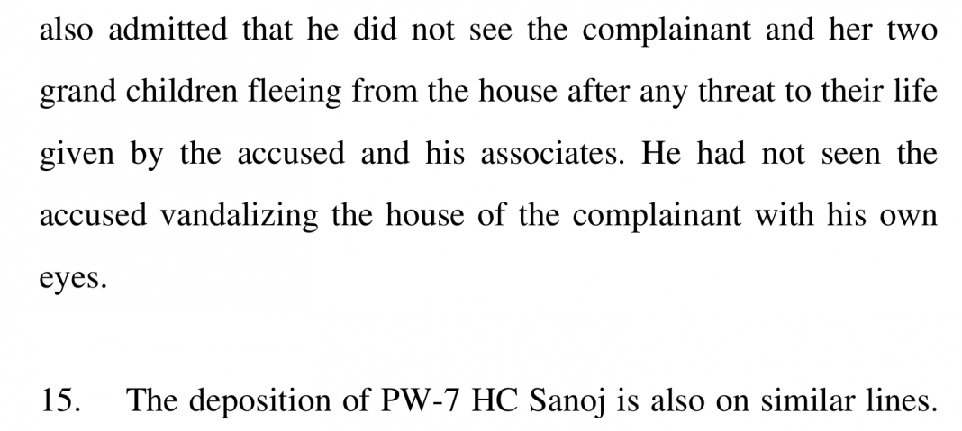 Vipin and Sanoj, who were on riot control duty in the area, have deposed saying that they have zero evidence against Dinesh except for the fact that they simply saw him in the area. He did not issue threats, he did not vandalise, he was not in possession of any danda or the buffalo stolen from Manori’s house – nothing. He was just there.