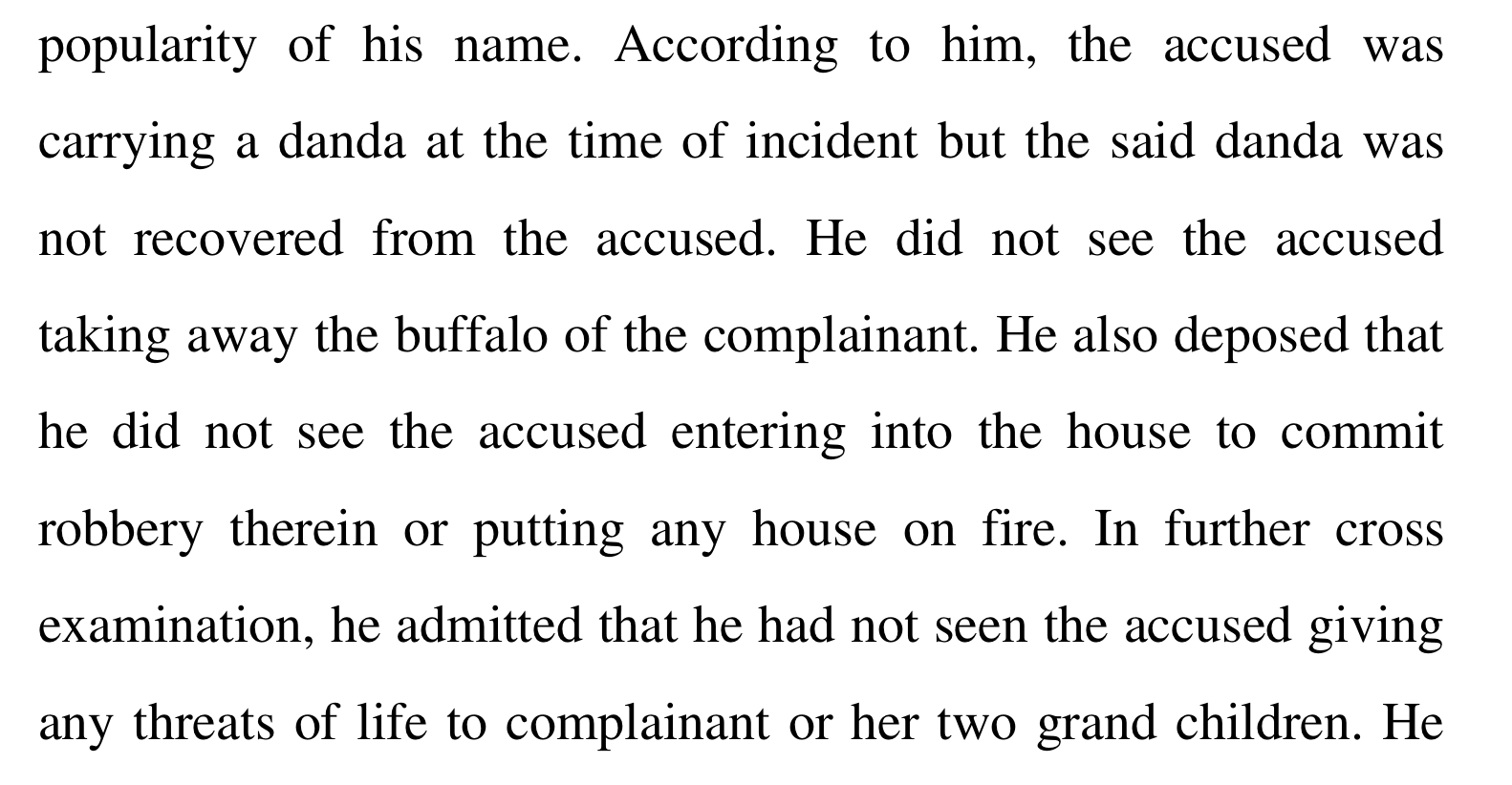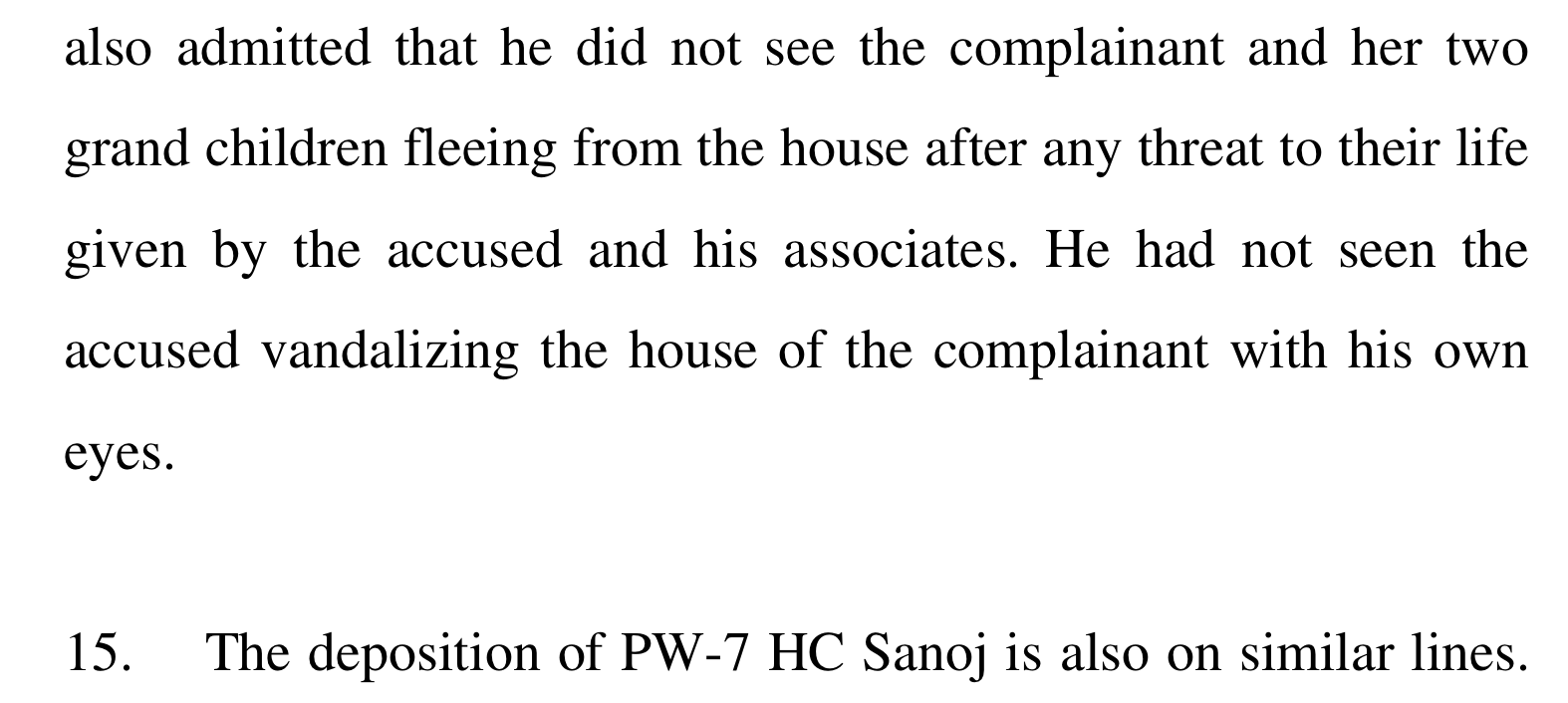 The court examined two other key witnesses – Vipin and Sanoj – both police officers. One would think that these two had at least seen Dinesh giving a threat, entering the house, vandalising, setting fire or doing something illegal at the time. If not, at least that he was in possession of some incrementing material, the buffalo or the calf that was stolen from Manori’s house or any of the articles stolen to establish his role in the crime. That, however, is not the case.