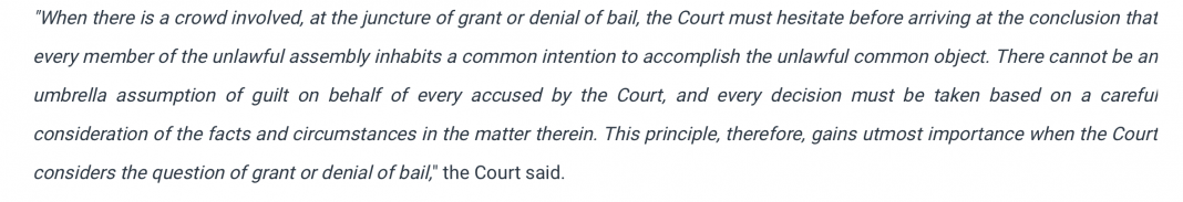 Justice Subramonium Prasad, while granting bail to those accused in the Dilbar Negi murder case had said that the court needs to hesitate before arriving at the conclusion that every member of the unlawful assembly inhabits a common intention and that there cannot be umbrella assumption of guilty. This logic was extended to give bail to the accused in the Negi murder case, however, the same provisions were used, guilt assumed, to convict Dinesh Yadav.