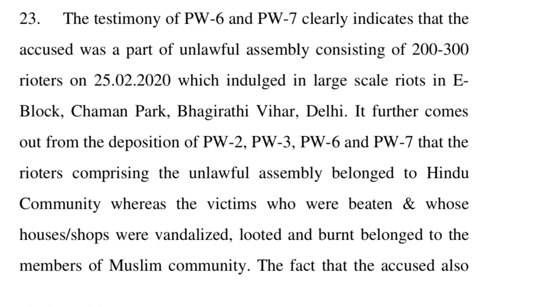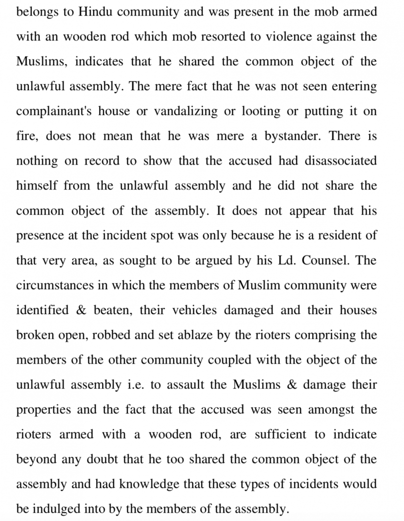 However, they say that from the testimony of Vipin and Sanoj, it is “clear” that he was a part of the mob that looted, vandalised and were identifying Muslims to beat them up. Further, it says that from the testimony of the complainant, it is clear that there was indeed large scale violence and the mob was carrying lathis, therefore, the mob was an illegal one.