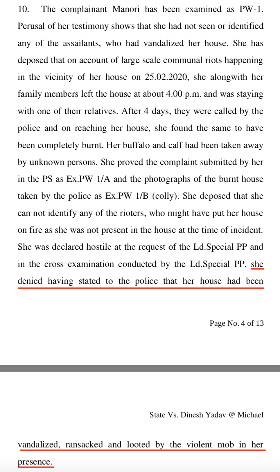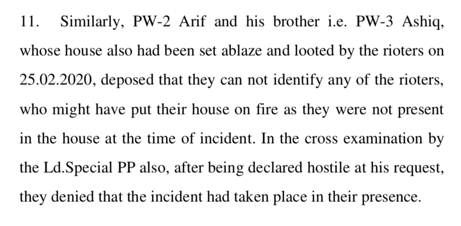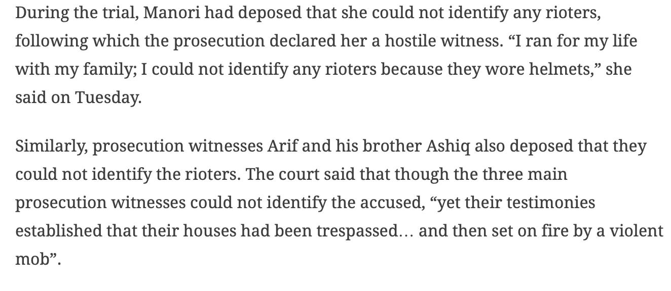 Manori, along with her family members and witnesses based on whose testimony Dinesh has been convicted, Ashiq and Arif, all denied telling the police that their house was vandalised in their presence and asserted that since they were not present in the house, they cannot identify any of the rioters. In fact, they were declared hostile by the public prosecutor during cross-examination because the prosecutor needed to disprove the assertion that they were not present in the house when the vandalisation took place.