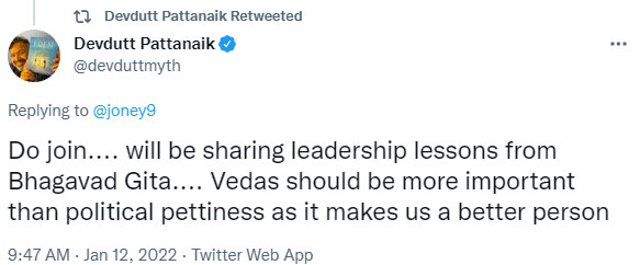 In reply to a tweet by one Abhilaash who congratulated him for being invited to the program, Pattnaik said, “Do join…. will be sharing leadership lessons from Bhagavad Gita… Vedas should be more important than political pettiness as it makes us a better person.”