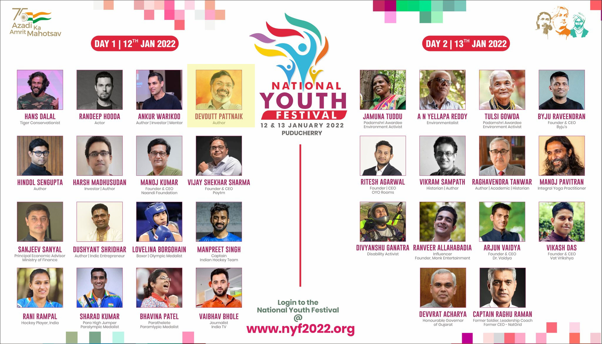 The Ministry of Youth Affairs and Sports, Government of India, has invited author Devdutt Pattnaik as a speaker for a two-day event National Youth Festival that is being inaugurated today. Pattnaik is scheduled to speak on the first day of the event.