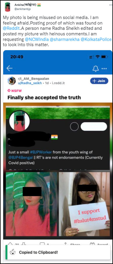 On January 24, a woman named Ankita from West Bengal posted a tweet with the screenshot of a post by a Reddit group ‘I_AM_Bengaalan’ whose photograph was misused. Ankita, who is a BJP worker, said wrote, “My photo is being misused on social media. I am feeling afraid. Posting proof of which was found on Reddit. A person named Radha Sheikh edited and posted my picture with heinous comments. I am requesting NCW, Rekha Sharma, Kolkata Police, to look into this matter.”
