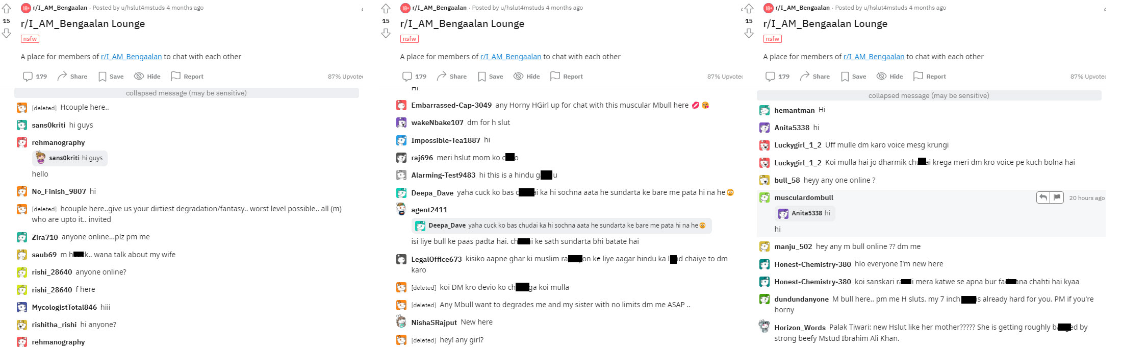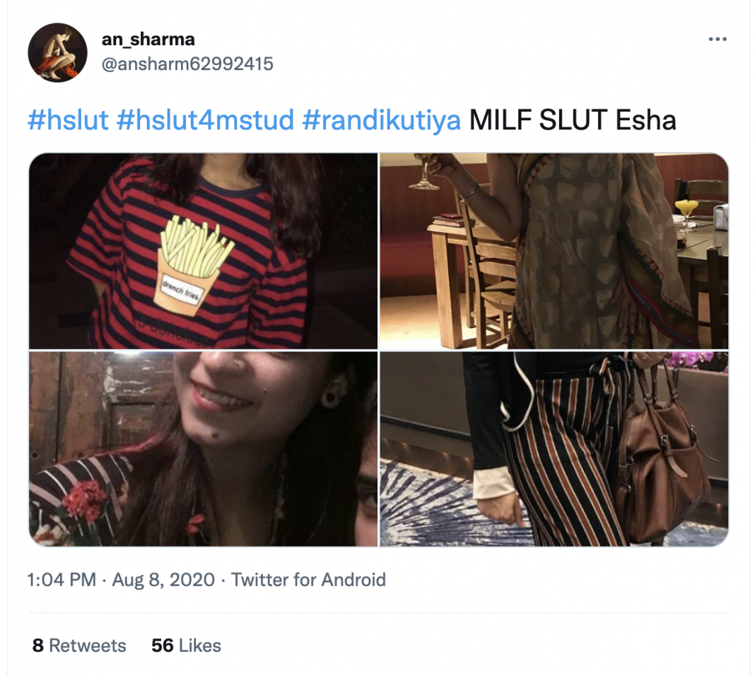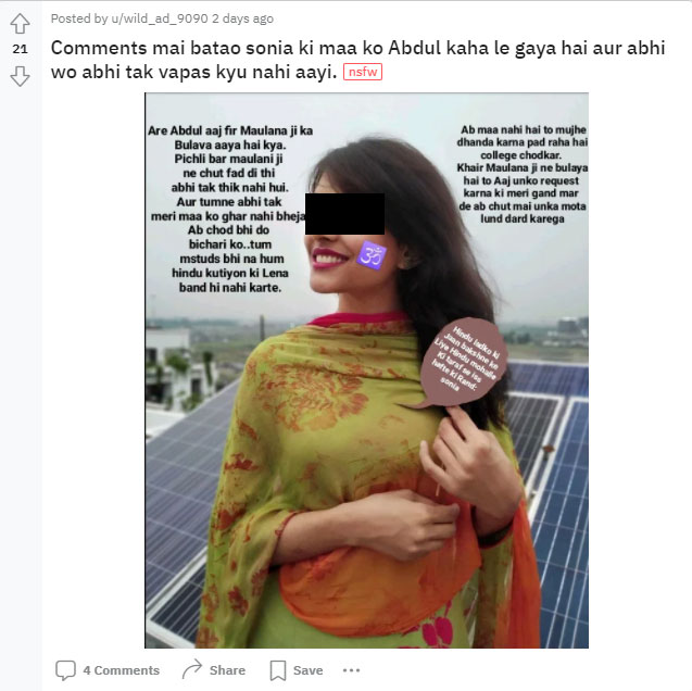 Many such posts are posted by accounts with names which sound like that of Hindu women. However, they frequently speak about sexual objectification of women and use offensive terms and vulgar language for them.