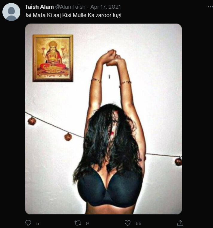In a now removed tweet, a Twitter user named Rashed shared about his ‘Hindu wife’ with crass and sexual remarks on an image of a woman.