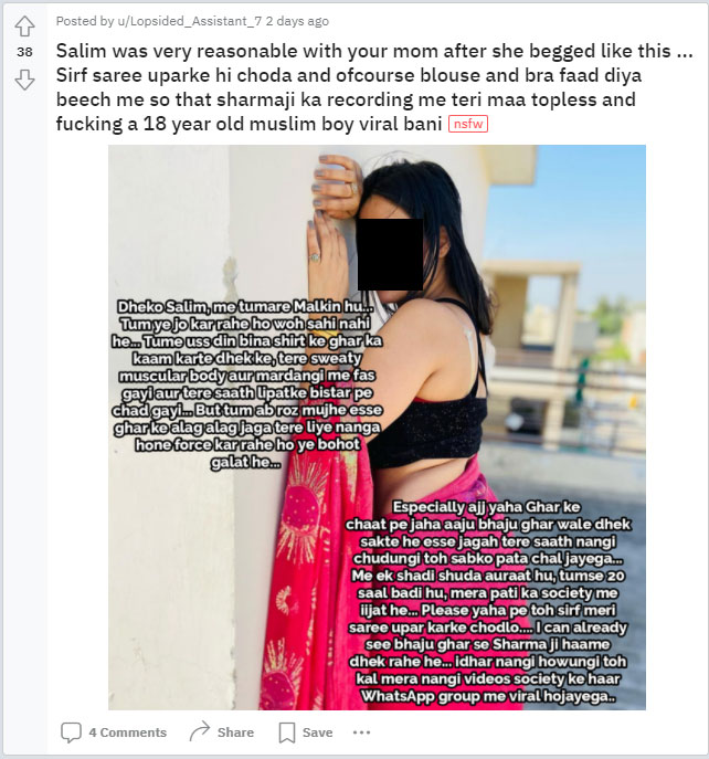 In one of the posts, a photograph probably picked from a social media account was posted with the caption that roughly translates to “Salim was very reasonable with your mom after she begged like this. He f**ked her after lifting her saree and ripped her undergarments that’s why the recording of Sharmaji can go viral.”