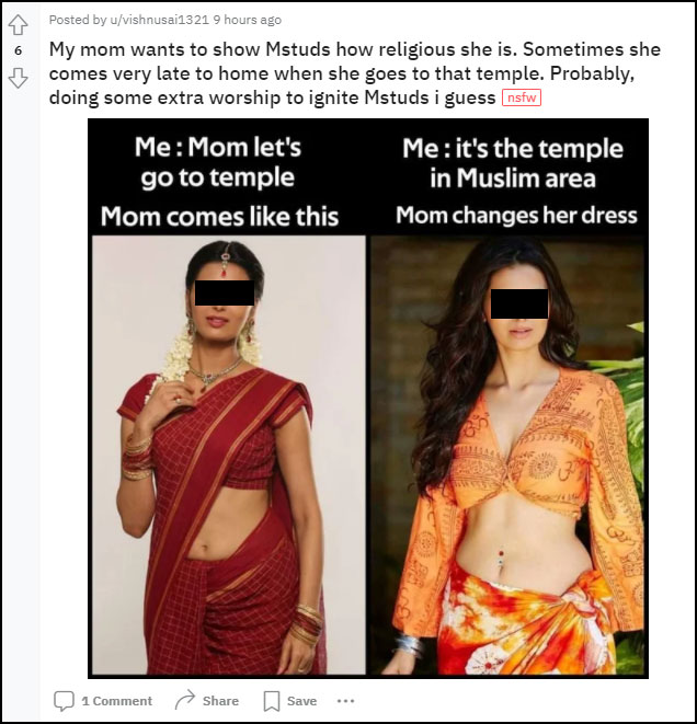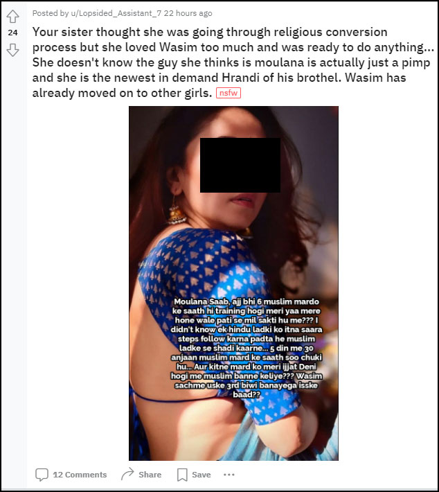 OpIndia had earlier reported that Reddit as a platform has been an underbelly for vile and bigoted propaganda as well as grooming jihad. Pornographic content is regularly shared on Reddit with an intention to cause communal tension and strife. The pornographic images often show Hindu women lusting for Muslim men.