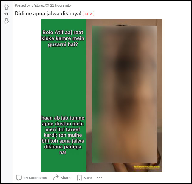 In one of the most shocking posts, a nude photograph of a woman was posted with the caption, “Sister finally showed her true colours.” The text on the image read, “Tell me Atif, in whose room would you like to spend the night.”