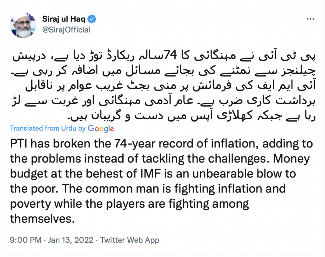Sirajul Haq added that Imran Khan has become an “international beggar” as a result of Pakistan’s arrangement with the International Monetary Fund (IMF), while the current government, which he described as a “combination of different parties,” is unable to control the country, reported Geo News Pakistan.