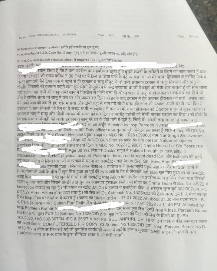 The complainant of this incident is Arjun, nephew of the deceased Hiralal. In the complaint given to the police, it is stated, “The incident happened on January 17 at around 7.30 pm. The attack on Hiralal took place in Dadia Park of B4 Colony of Sultanpuri. When Hiralal and Narsingh went to the park, Irfan and his brother Sanu were already present there. Irfan had a knife in his hand and Sanu had a pistol in his hand. Irfan said that you sent me to jail in the rape case. Sanu instigated Irfan to kill both of them. Irfan attacked Hiralal with knives. Sanu opened fire on Hiralal and Narsingh who went to save him. Hiralal was also hit with a brick.” After the attack, both the victims were taken to Sanjay Gandhi Hospital where Hiralal was declared dead. Narsingh, 42, also sustained bullet injuries and is undergoing treatment.