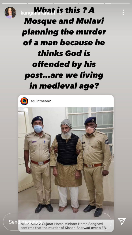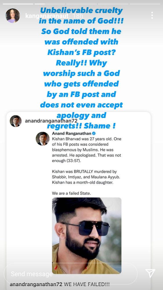 Ranaut also shared stories on her Instagram account. In one of the stories, she shared a screenshot of scientist and author Anand Ranganathan’s post in which he had talked about the death of Kishan Bharwad. Ranaut said, “Unbelievable cruelty in the name of God!!! So God told them he was offended with Kishan’s FB post? Really!? Why worship such a God who gets offended by an FB post and does not even accept apology and regrets!! Shame!”