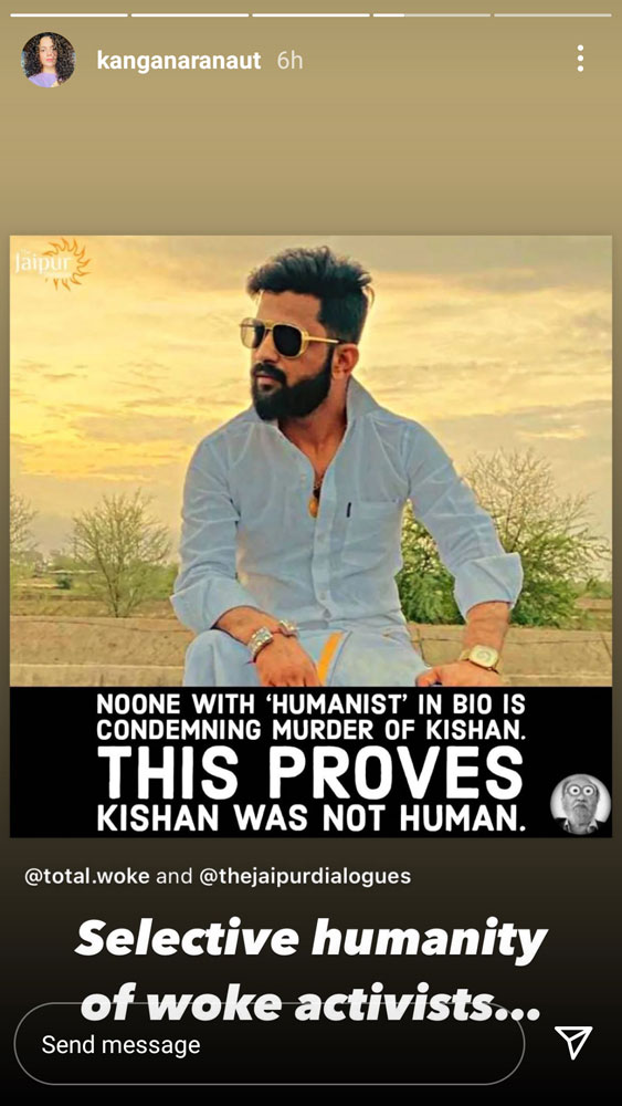 Ranaut continued to share stories on the matter. In a follow-up story, she called out so-called ‘humanist’ and questioned them for not condemning the murder of Kishan. She said, “No one with ‘Humanist’ in bio is condemning murder of Kishan. This proves Kishan was not human. Selective humanity of woke activists…”
