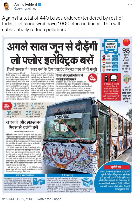 In a tweet dated 12 July 2018, Kejriwal shared a news report that said the Aam Aadmi Party government in Delhi would deploy over 1,000 electric buses by June 2019.