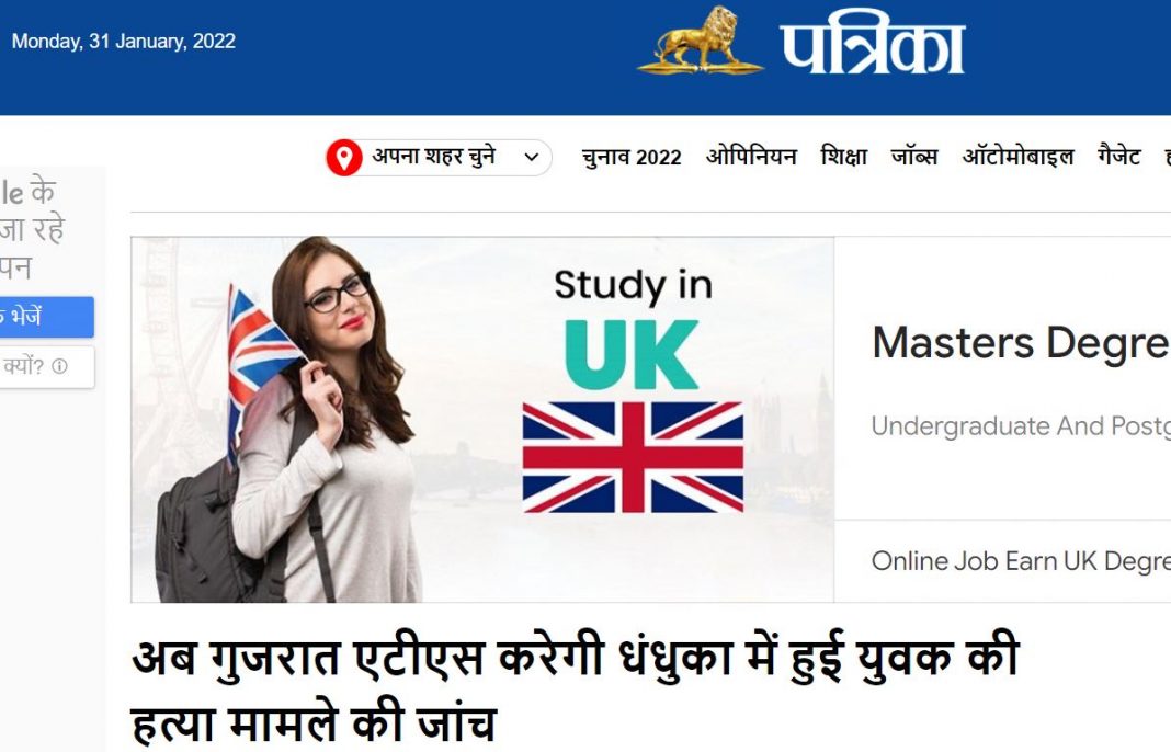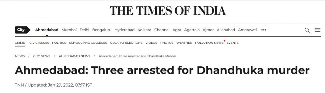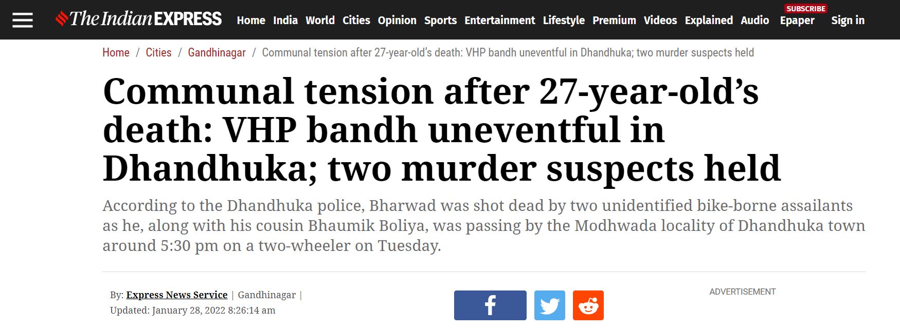 The Indian Express in its report dated January 28, reported the murder of the Hindu youth with the headline: “Communal tension after 27-year-old’s death: VHP bandh uneventful in Dhandhuka; two murder suspects held”.