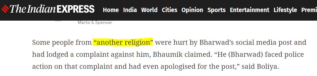 In fact, The Indian Express has not only carefully crafted its headline to shield the Islamist perpetrators but has been extremely cautious while wording the entire report. To dilute the offence, it has used the term “people of another religion” instead of terms like Islam, blasphemy, or Muslims.