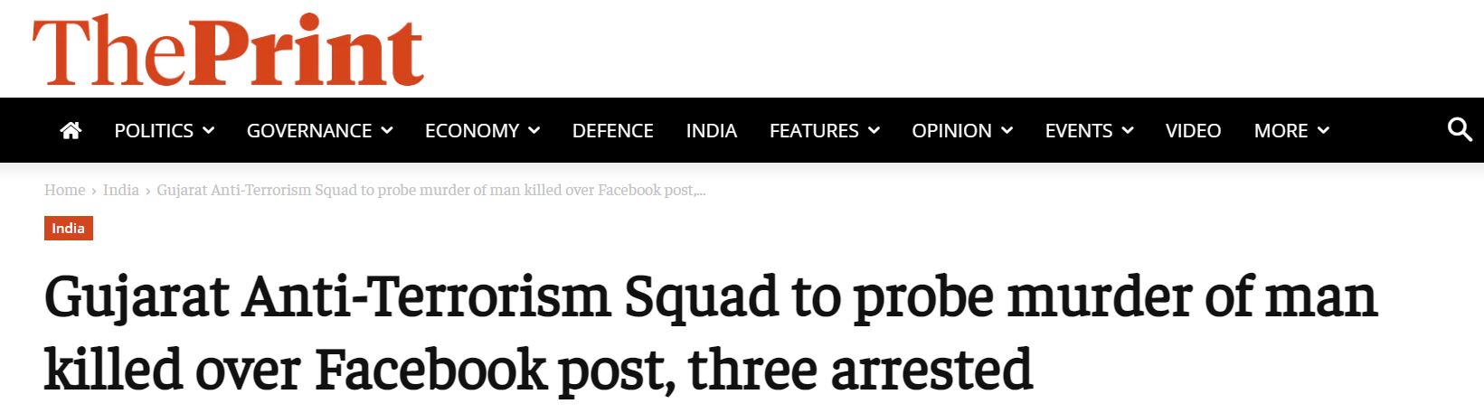 Likewise, Shekhar Gupta run ThePrint, a publication that has a history of whitewashing crimes against Hindus, published a report on the incident on January 30 with the headline: “Gujarat Anti-Terrorism Squad to probe murder of a man killed over Facebook post, three arrested.”