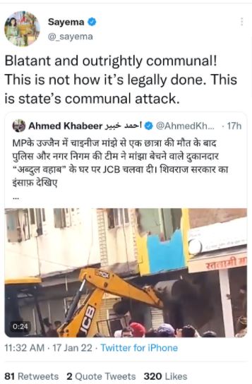 Jamia Times journalist Ahmed Khabeer was the first one to peddle the ridiculous claim with his Tweet that read: “In MPK Ujjain, after the death of a student from Chinese manjha, the police and municipal team got the JCB run at the house of ‘Abdul Wahab’. He was a shopkeeper selling manjha, this is justice under the Shivraj government.”