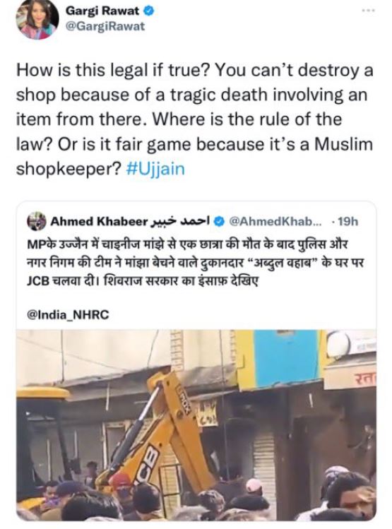 “Deleted a previous tweet as 3 shops have been demolished in Ujjain. But the issue remains over taking such action as a punishment for selling illegal Chinese string for kites. It’s not the legal course,” Gargi Rawat wrote in her subsequent Tweet.
