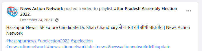 In the video, they said Chaudhary has political links and contesting elections on a Samajwadi Party ticket from the Hasanpur Assembly seat. However, we could not confirm if Shan Chaudhary is contesting election on the Samajwadi Party ticket as the list released by SP named someone else. It is noteworthy that in some of the videos uploaded by News Action Network, Shan has been named as “Future SP Candidate”.