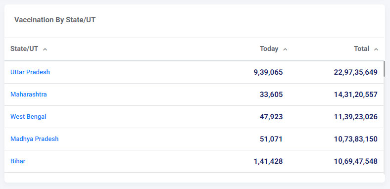 Uttar Pradesh is leading the tally with over 22 crores (22,97,35,649) of Covid-19 vaccine doses administered in the state. Maharashtra is second in the tally, with over 14 crores (14,31,20,557) doses administered. Madhya Pradesh is on the third spot with over 11 crore doses administered, Bihar at fourth with over 10.73 crore doses administered and West Bengal on fifth with 10.69 crore doses administered.