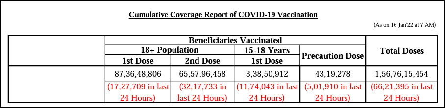 According to the data available with the Ministry of Health and Family Welfare (MOHFA), a total of over 1.56 crore (1,56,76,15,454) Covid-19 vaccine doses have been administered in India. Over 87 crore (87,36,48,806 ) people have got at least one shot of Covid-19 vaccine and over 65 crore (65,57,96,458) people are fully vaccinated. Talking about the eligible children, over three crores (3,38,50,912) have got their first dose of the vaccine. Stats show that 43,19,278 people have got their precautionary dose, out of which over five lakhs were administered in the last 24 hours.