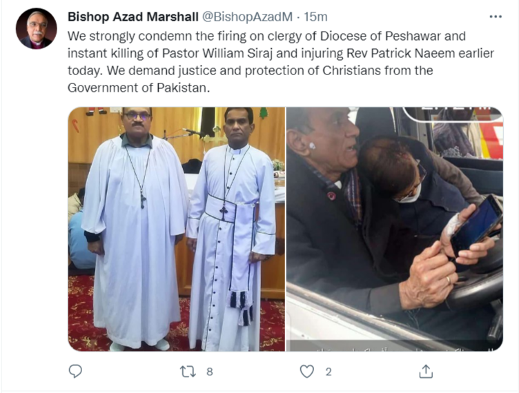 The dastardly attack was condemned by several people on social media. President of Bishop Church of Pakistan, Azad Marshall, tweeted, “We strongly condemn the firing on clergy of Diocese of Peshawar and instant killing of Pastor William Siraj and injuring Rev Patrick Naeem earlier today. We demand justice and protection of Christians from the Government of Pakistan.”