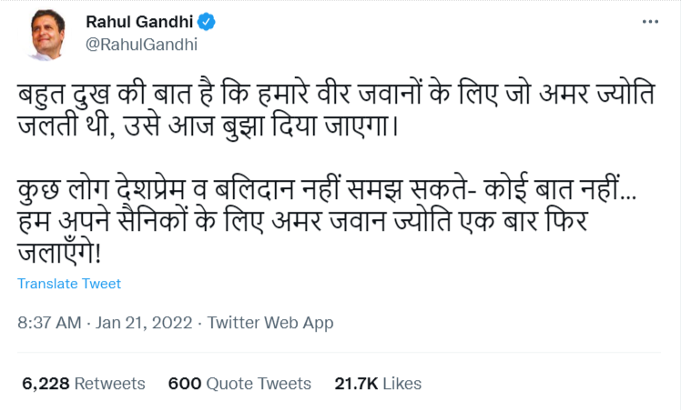 In a tweet, Rahul Gandhi alleged, “It is a matter of grief that the light of Amar Jawan Jyoti will be extinguished today. Some people will never understand the concept of patriotism and supreme sacrifice. Never mind. We will once again light the Amar Jawan Jyoti in memory of our brave soldiers.”