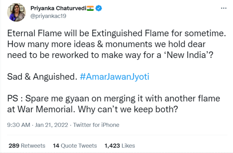 Shiv Sena, an ally of the Congress party in the Maha Vikas Aghadi government, also cast aspersions about the fate of Amar Jawan Jyoti. In a tweet, Sena leader Priyanka Chaturvedi claimed, “Eternal Flame will be Extinguished Flame for sometime. How many more ideas & monuments we hold dear need to be reworked to make way for a ‘New India’? Sad & Anguished. #AmarJawanJyoti. PS : Spare me gyaan on merging it with another flame at War Memorial. Why can’t we keep both?”