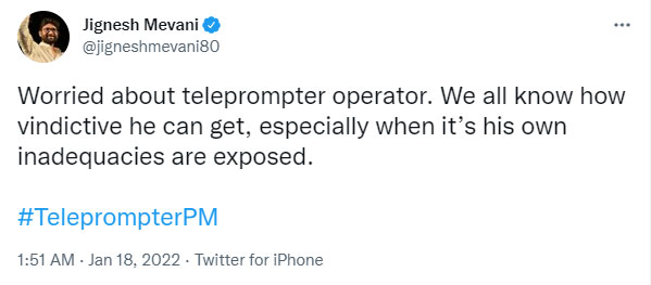 Congress leader Jignesh Mevani said, “Worried about teleprompter operator. We all know how vindictive he can get, especially when it’s his own inadequacies are exposed.”