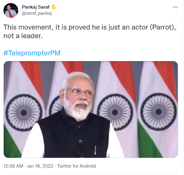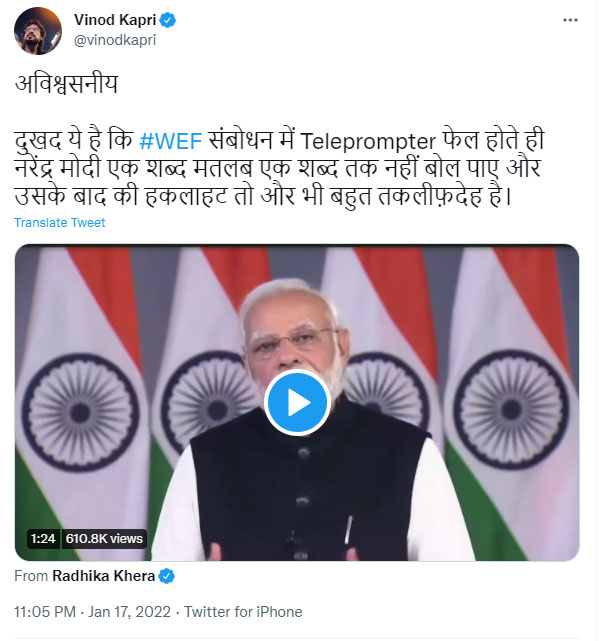 Filmmaker Vinod Kapri said, “Unbelievable. The sad thing is that as soon as the teleprompter failed in the #WEF address, Narendra Modi could not utter a single word, and the stammer after that is even more painful.” Kapri is known for his anti-Modi and anti-BJP rants.