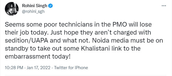 Several verified Twitter trolls, some of them masquerading as journalists, saw the technical glitch as an opportunity to run their agenda-filled propaganda against PM Modi. The Wire journalist Rohini Singh said, “Seems some poor technicians in the PMO will lose their job today. Just hope they aren’t charged with sedition/UAPA and what not. Noida media must be on standby to take out some Khalistani link to the embarrassment today!”