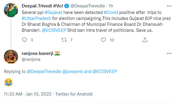 On January 10, Ranjona Banerji, journalist and board member of Latika Roy memorial, expressed her happiness over Bharatiya Janata Party leaders testing positive for Covid-19. She was replying to a tweet of another journalist Deepal Trivedi of Vibes of India, where she had urged the Election Commission to ban intra-state travel amidst the Covid-19 pandemic for election rallies. Banerji replied to the tweet with a laughing emoji.