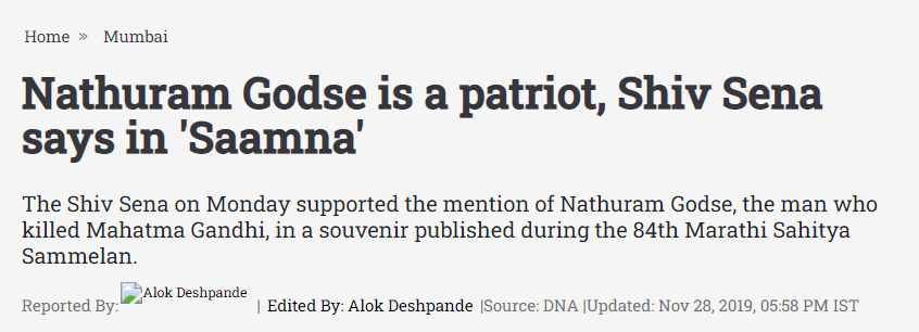 It was only in August last year, that Sanjay Raut had taken a so-called moderate stance on Nathuram Godse questioning his act holding Gandhi responsible for partition and killing him instead of Jinnah. On Sunday, Raut seems to have reiterated this stance owing to Shiv Sena’s alliance with Congress and the NCP in Maharashtra.